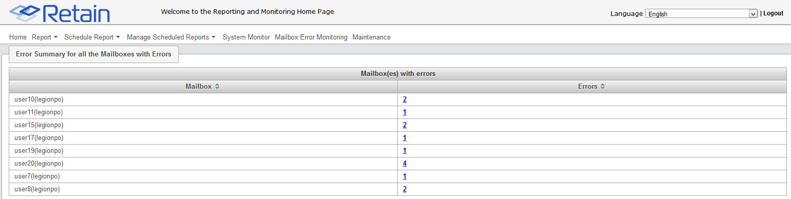 Clicking on "Mailbox Error Monitoring" will open a new window or tab. This will show the Mailbox Error Monitoring page of the Reporting and Monitoring server.