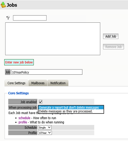 Core Settings allows you to choose between Generate a report but don't delete message and Delete messages as they are processed when processing the job.