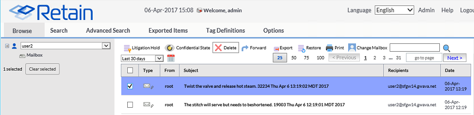 Delete Messages: Individual emails may also be removed from Retain.