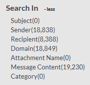 Once search results have begun to populate, the left hand scope pane is populated with limiting and filtering options. If faceting is enabled the side bar will show numbers next to each section, indicating how many hits there are for each particular topic. The hits are total numbers of matching instances, not items. So if a message states a search term several times in the message body, it will be counted as that many hits even though it is only one message.