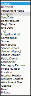 The Search Criteria contains the ability to specify where to search, operating criteria - (word ends with, word starts with, field contains words, field contains phrase), and the desired search terms. The list of search items and fields available to be specified in the drop-down list is shown. Each variable on the list is tied to appropriate search operators, (date range allows the specification of a date, Confidential tags have a true/false operator, etc.)