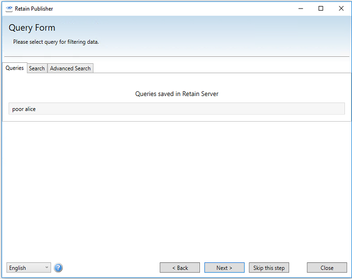 Select or create a query to filter the scope of the export job. There are three tabs but you only need to use the one you need to build the query. You can use a query saved in the Retain Web console, a simple search or an advanced search.