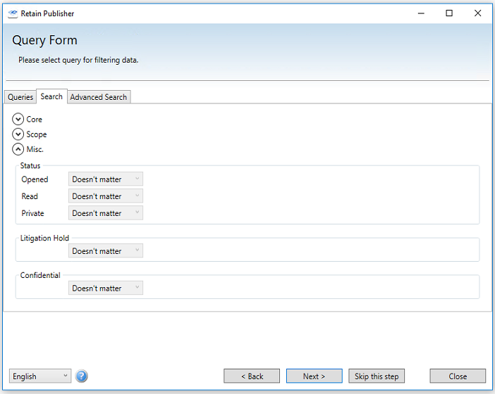 The Publisher may restrict what mail or items are published into the message archive by specifying search or query terms. If a message or item does not apply to the search terms, it will not be added to the published archive. There are three opportunities to specify search terms or criteria; Core (query), Scope, and Misc.