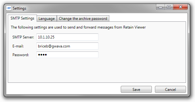 The Forward, and forward as attachment options, (found both on the main toolbar, as well as a drop down menu in the toolbar in the view window), allow the Retain Viewer to send the selected message from the archive to a destination account. ‘Forward’ functions exactly as the forward function in an email client. The ‘Forward as attachment’ creates an attachment from the selected email and attaches it to a message sent.