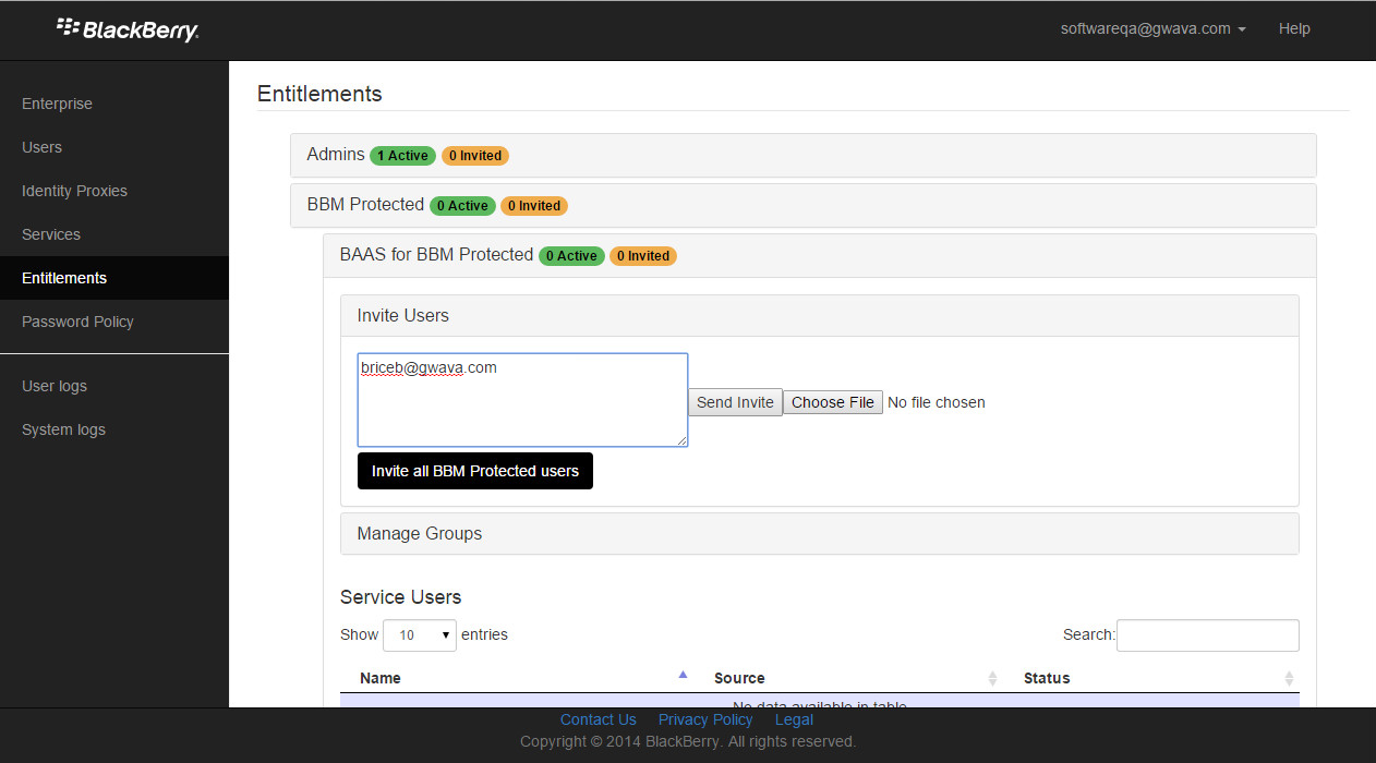 Enter ‘entitlements’ and invite users/devices to be added to the service (In this case BBM Enterprise)