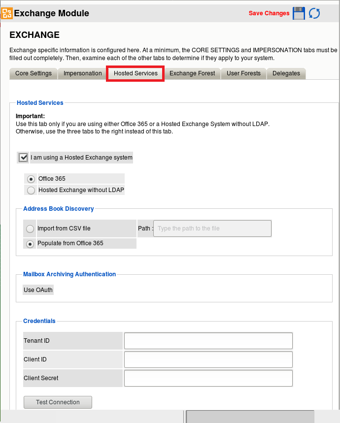 In the Service Connection Details tab, configure the module to populate the address book using Office 365.