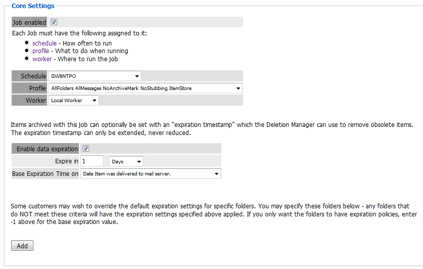 The core settings consist of an enabled/disabled option which must be enabled for any jobs based on this profile to archive anything.