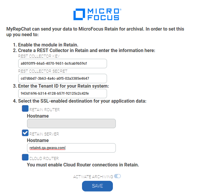 Enter the information gathered in Configuring the Ionlake Module in Retain in your ionlake MyRepChat system to send the archive data to Retain. Below is a screen shot of the MyRepChat interface to enter your Retain information: