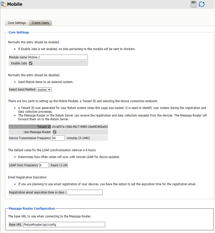 Path: Retain Server Manager > Configuration > Module Configuration > Mobile-Configure > Core Settings