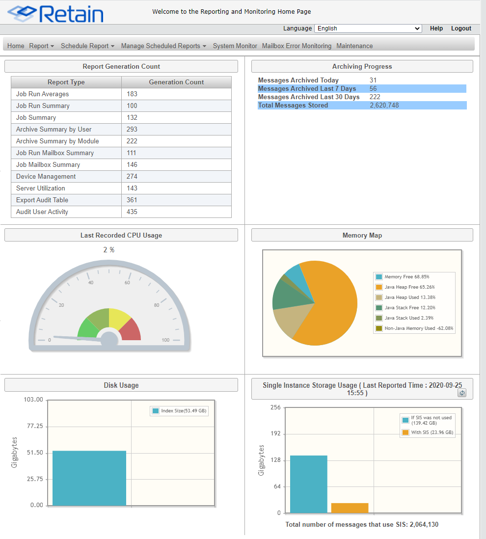 Disk Usage: This reports the disk space consumed by Retain’s data index.