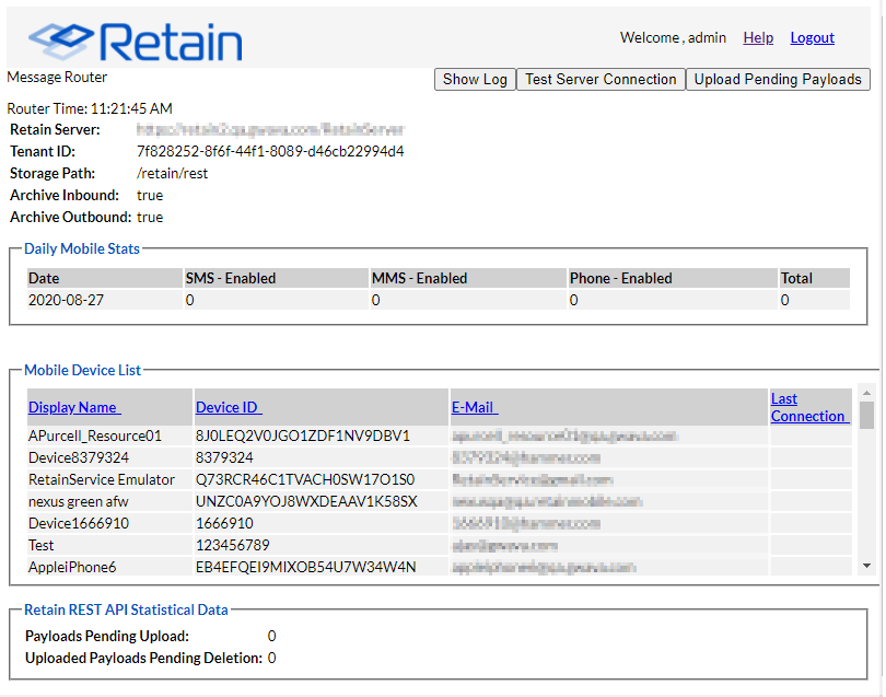 The Message Router console lets you view the devices that connect to Retain through the router and the state of temporarily stored communications (payloads) waiting to be transferred to Retain.
