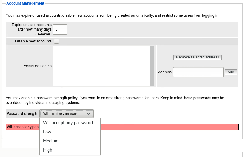 Use this to specify password strength for a user account. Settings on a back-end messaging system override this. User-created passwords can be required to meet specific requirements.