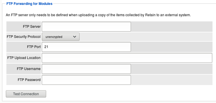FTP Forwarding is designed for exporting data to an external FTP server for redundant archival. While the FTP Forwarding service does not have the inherent danger of duplicating data as the SMTP Forwarding feature does, it is important to note that should the exported data be sent through any system the Retain system archives, it will duplicate data in the Retain archive. FTP forwarding simply sends a copy of the data in the format that it is received, (Mime, text, etc.). The FTP Forwarding service is run every 10 minutes, checking for any data queued for delivery.