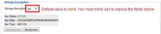 IMPORTANT:The following options, fields, etc. display only after you change the Storage Encryption option to aes. |