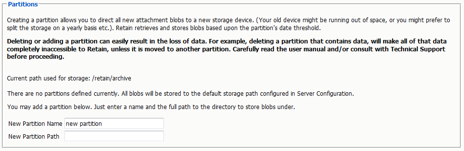 Because of how Retain indexes and tracks messages that are archived, deleting a partition can lead to catastrophic data loss. Do not delete an active storage partition or location without first consulting support.