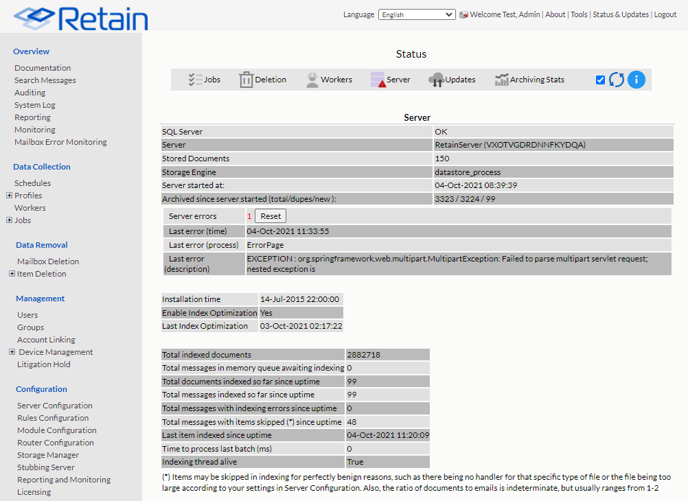The Server tab shows the basic status of the Server with the messages archived and maintenance information. |