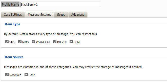 Path: Retain Server Manager > Data Collection > Profiles > Blackberry > Select the Profile > Message Settings
