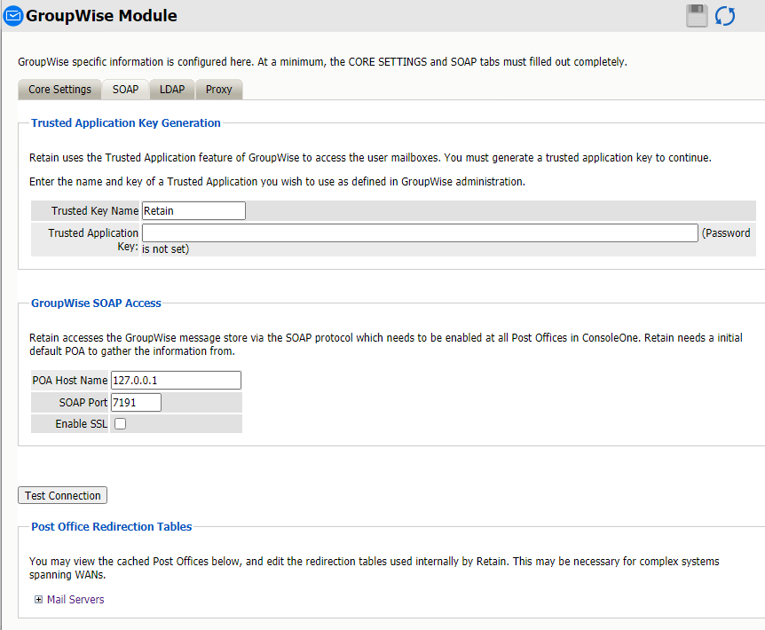 Path: Retain Server Manager > Configuration > Module Configuration > GroupWise-Configure > SOAP