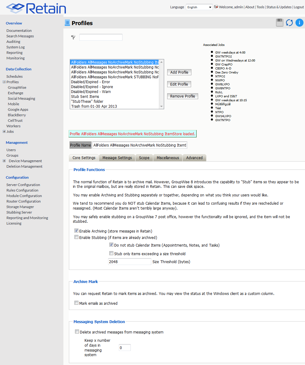 Path: Retain Server Manager > Data Collection > Profiles > GroupWise > Job Name > Core Settings