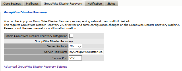Selecting this option tells the job to use the GroupWise Disaster Recovery Integration for systems utilizing GroupWise Disaster Recovery. See the GroupWise Disaster Recovery Integration section for instructions on configuration. The Server URL must be edited with the correct contact info for the GroupWise Disaster Recovery server. The default GroupWise Disaster Recovery port is 5555.