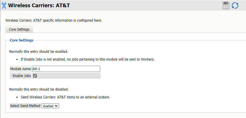 Path: Retain Server Manager > Configuration > Module Configuration > Wireless Carriers: AT&T-Configure > Core Settings