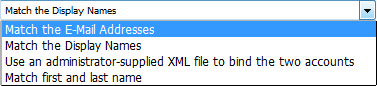 Accounts may be matched via email address, display names, and/or specified by an administrator supplied XML file. We generally recommend a combination of Email Addresses, Display Names and First and Last Names. The mapping will attempt to map by the first criteria and then continue down the list until it finds a match or not.