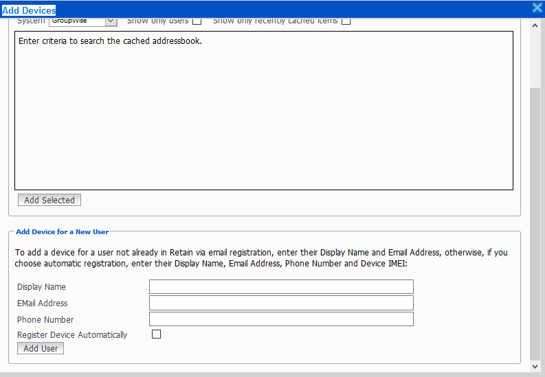 You can also add users which are not cached in the Retain system, but they must be added one at a time by manually entering the display name, email address, phone number and device IMEI associated with each device.