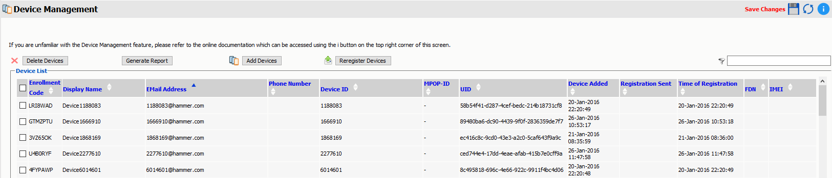 To register multiple devices, a file can be used to specify the Display Name, EMail Address, Phone Number, and Device International Mobile Equipment Identity (IMEI) Number for each device that is uploaded to Retain which will sent registration data to the device.