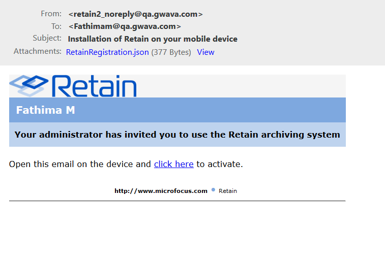 Retain creates an email which contains an activating link. Users need to open this email and follow the link on their mobile device. The link should be activated through the Retain application on the Android device. Therefore, the RetainService application must be installed on the Android device prior to clicking the activation link.