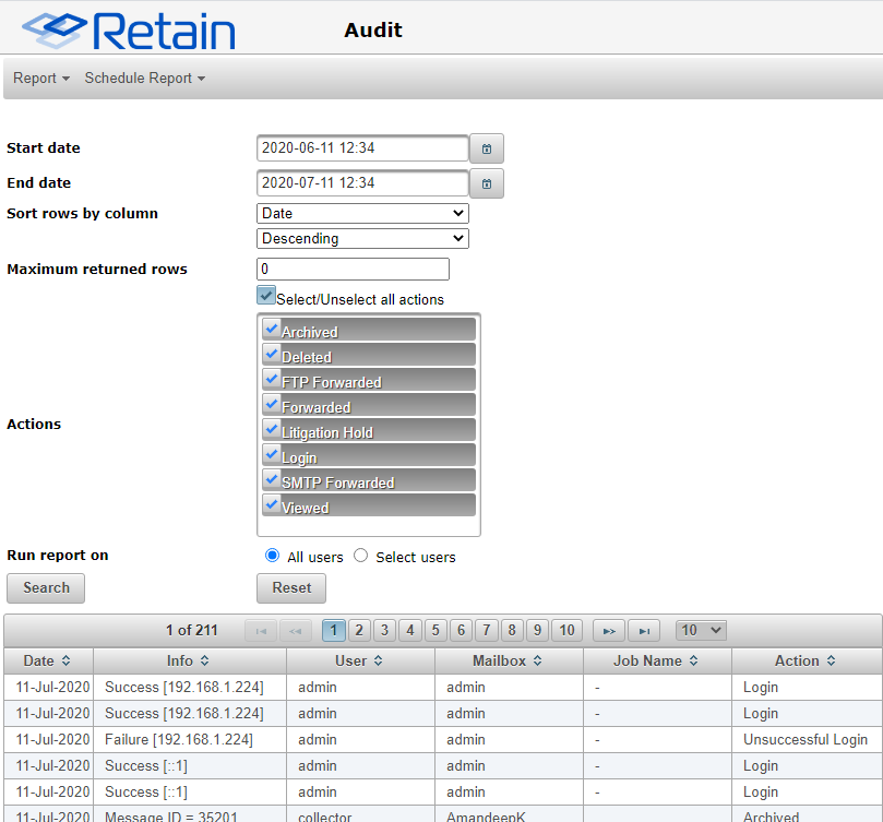 All pertinent actions performed by users in Retain are logged and can be discovered and printed. If Reporting and Monitoring is installed, four buttons are added to the following page, as shown below.