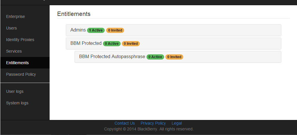 Enter ‘entitlements’ and invite users/devices to be added to the service (In this case BBM Enterprise)