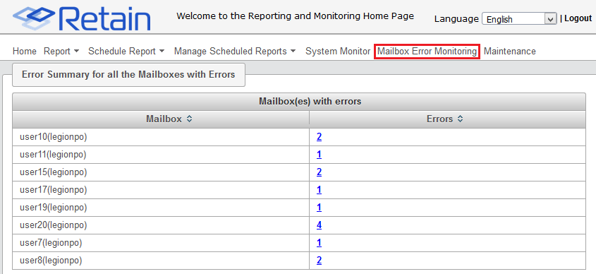 Path: Retain Reporting and Monitoring Server > Mailbox Error Monitoring Tab