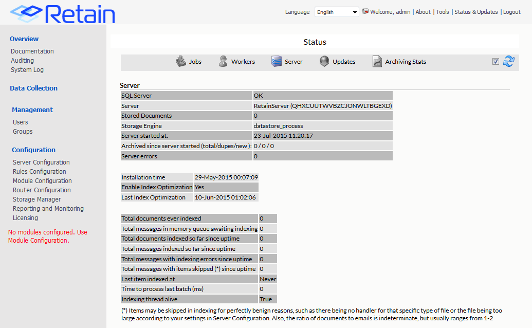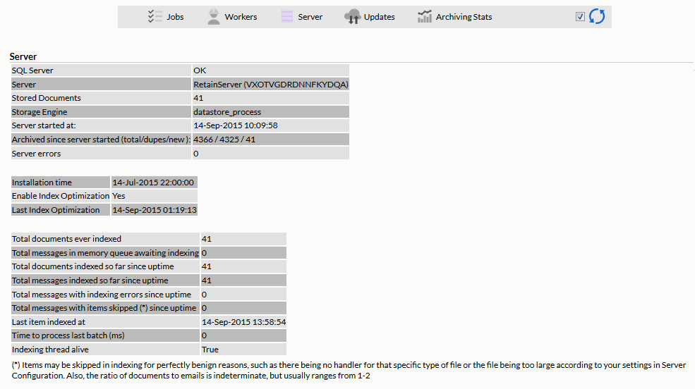 The Server tab shows the basic status of the Server with the messages archived and maintenance information.