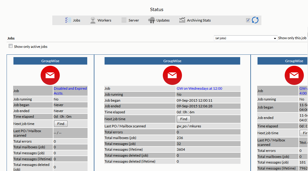 The Jobs tab, shown above, shows the jobs that are assigned to the server and their status. You also can select the “show only active jobs” check box, and only jobs that are currently running will be displayed.
