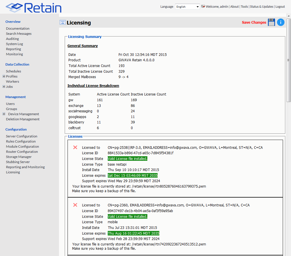 The Licensing page displays, manages, and reports on the licenses active in the Retain System. The status displays active users, inactive users, merged mailboxes, and individual counts for active and inactive users on each licensed module.