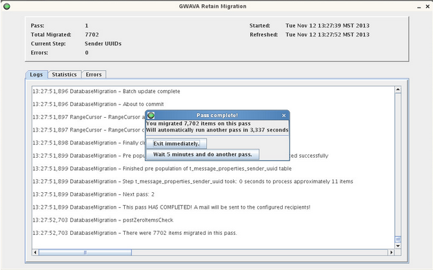 Below that, it states the number of items migrated for that pass and states that it will automatically run another pass in x,xxx seconds, which is a countdown of an hour (in seconds) from the time the first pass ended.