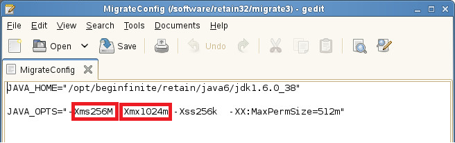 This sets the minimum and maximum Java memory heap value to 4G each. This will not work if you do not have 4G free memory on the machine (and you'll want to reserve at least 2 GB free memory for the OS), so be sure to check that before proceeding. If you are running the Migrator on the Retain server and you do not have 4G free, see how much is allocated to Tomcat and consider lowering it TEMPORARILY to free up space for the migrator. See "How to Adjust the Tomcat Memory Settings on Linux"; however, the ideal solution would be to add memory to the server itself.