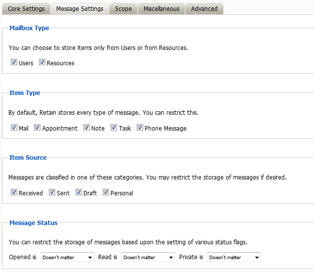The Advanced tab allows you to limit what is stored by Retain. This must be used with caution as this opens holes for data to be lost through. It is recommended to store everything since storage space is inexpensive.