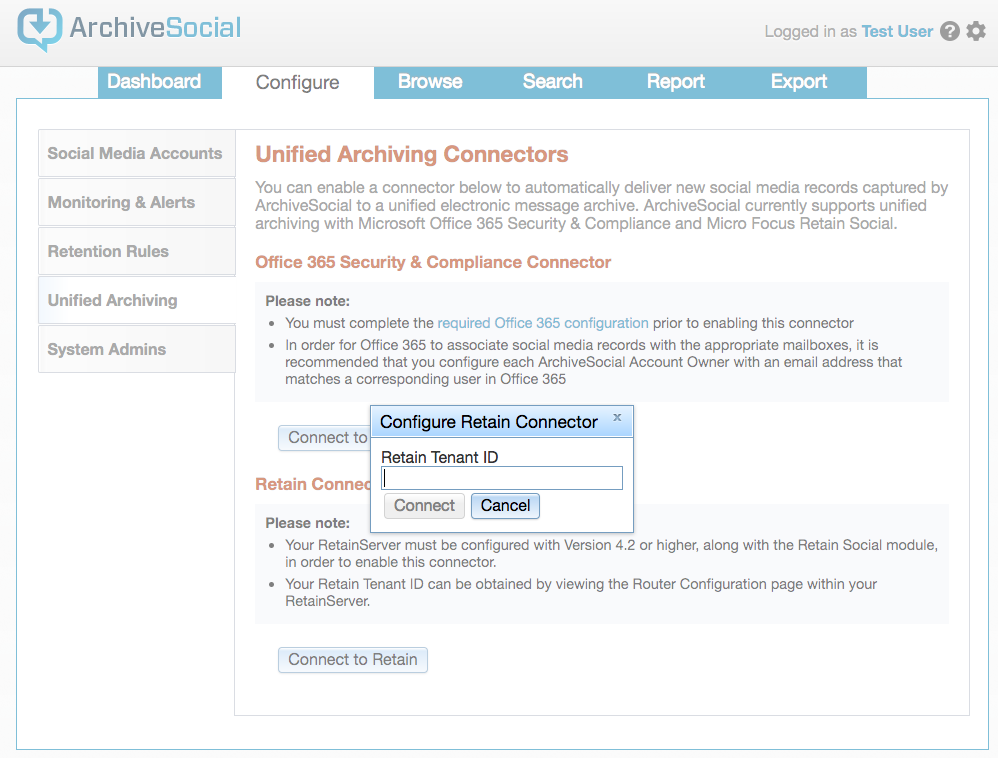 Click the Connect to Retain button and input whatever tenant id you want to send content to and hit connect and then you’re all set. At this point new content captured will be sent to the specified tenant.
