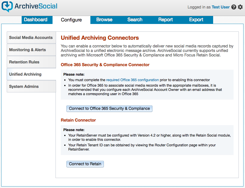On the left sidebar there should be a Unified Archiving tab click there to open up page for connecting integrations: