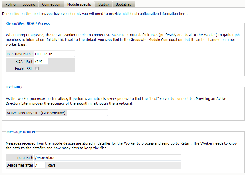 The Connection tab holds very important contact information for the worker’s connection to the Retain Server and the Post Office. Make sure that the Retain Server connection address is correct, or the Retain Worker will not be able to talk to the server.