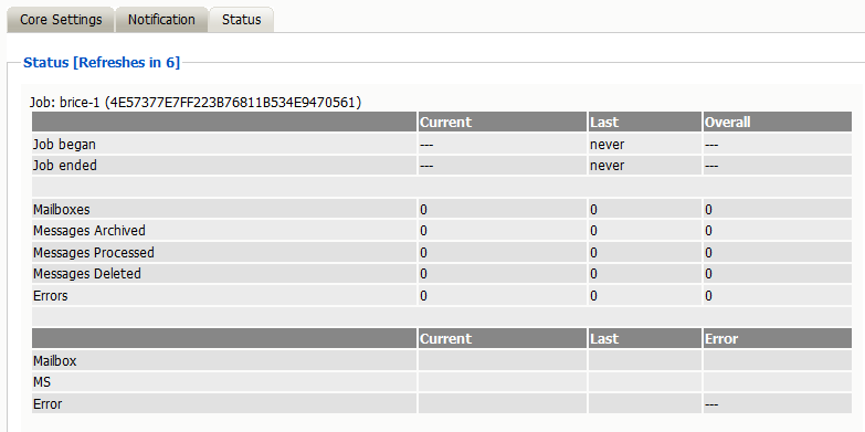 The Status tab displays the status of any currently running jobs, as well as the stats of the last completed job.