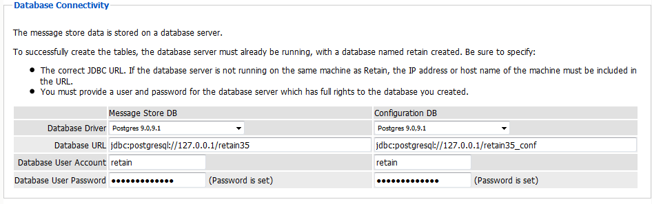 The Database Connectivity tab contains the connection information for both the configuration and storage databases. This information should never change unless the database server is being migrated to a new location.