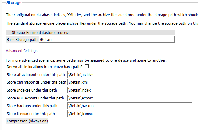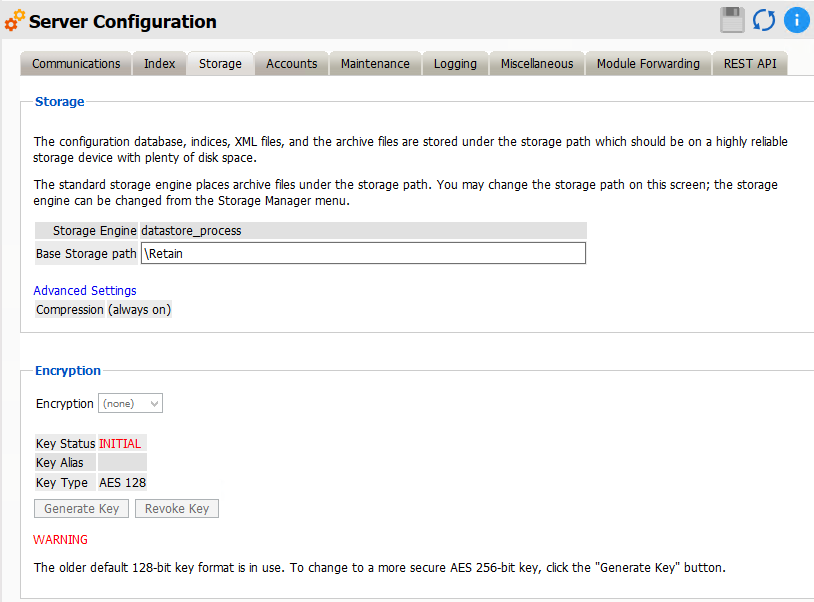 The default storage path for your Retain archives is listed here. You can also manage encryption of the BLOB files in the archive.
