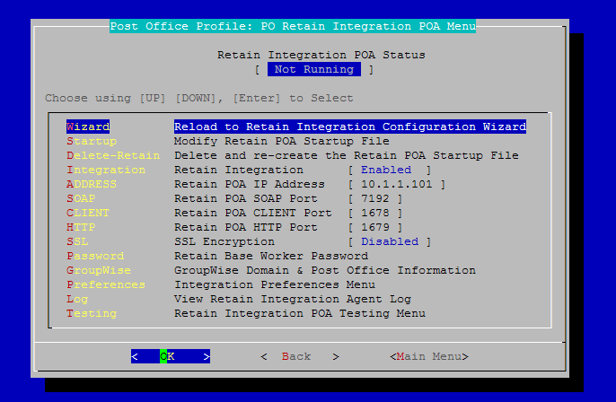 Now it’s worthwhile examining this menu. It contains all the settings you will need to make the Retain integration work. This will be a new post office agent running and it will not interfere with the POA being used to access, backup or disaster recovery. Thus, the settings NEED to be different. The easiest way to start is to run the wizard.