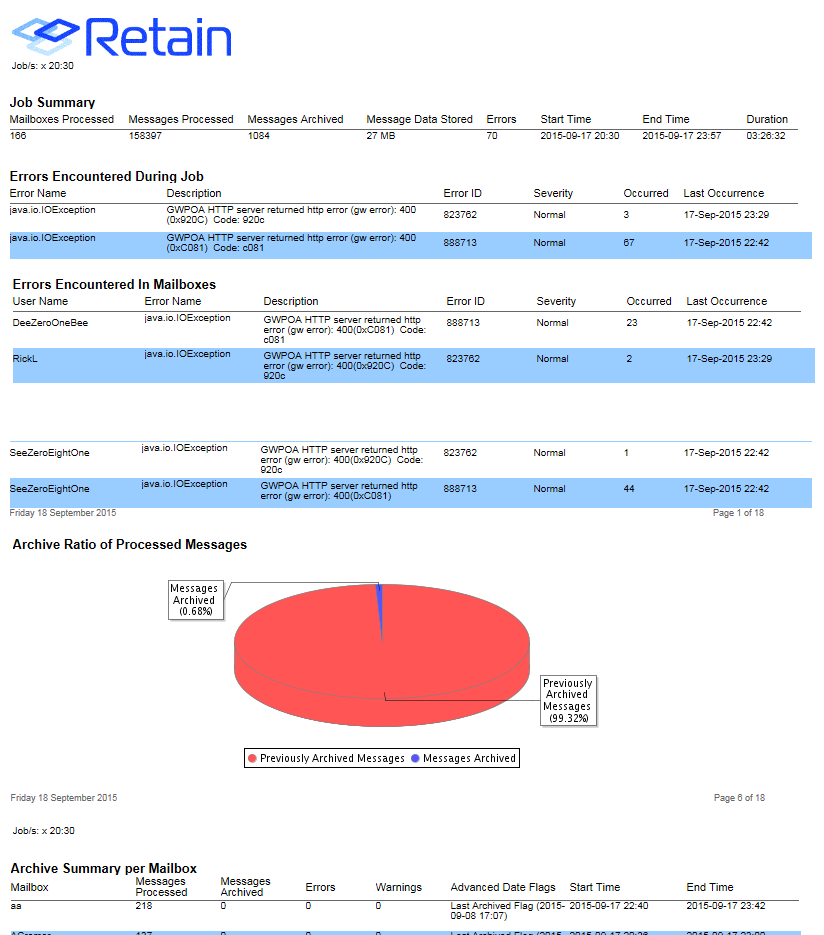 Finally, below the pie chart is a summary, by individual mailbox, of job actions. Each mailbox is displayed with the pertinent information, including the messages archived, messages processed, critical errors, a record of the advancement of message store flags, and the duration of the job in that mailbox.