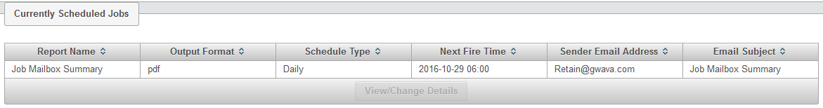 All reports under the ‘Report’ menu except ‘Job Run Mailbox Summary’, can be scheduled and have a ‘Schedule’ button at the bottom of the delivered HTML report. Selecting this button copies the settings used to generate the visible report to the Schedule Report interface. This convenience is designed to allow rapid fine-tuning of reports to deliver the desired information. First select the report you wish to run, and then fine-tune the report until it reaches the desired effect. Once the desired settings have been achieved, select the ‘Schedule’ button from the bottom of the report to carry all settings into the corresponding ‘Schedule Report’ interface, and schedule the report.