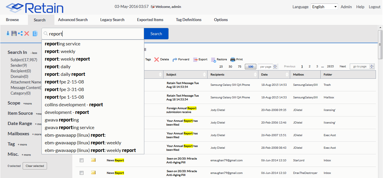 The search in Retain 4 is designed to work much like a Google search, with anticipated auto-correct search terms. The Search tab will allow searching across the entire Archive for administrators, while users will only be able to search their own archive.