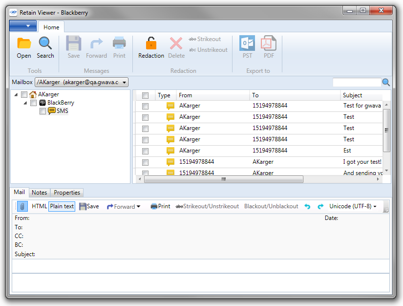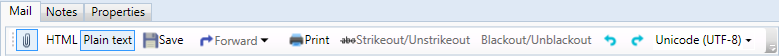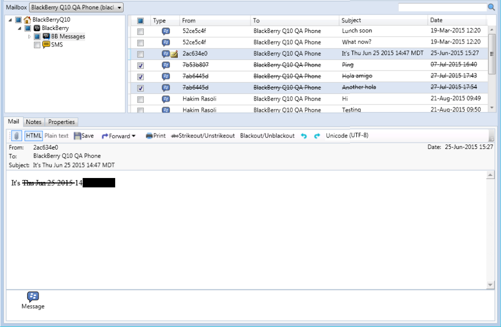 When Redaction is enabled, the ‘Strikeout/Unstrikeout’, ‘Black out’ options, and ‘Notes’ tab become active. The Notes tab works much like a notepad that is always connected to the archive. Items of interest or whole messages’ texts can be copied and compiled in the redaction notes. Messages with notes on them are marked in the archive viewer with a notepad icon in the message list.