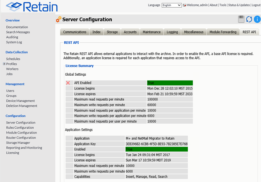 Browse to the Retain Server Web Console | Server Configuration | REST API
